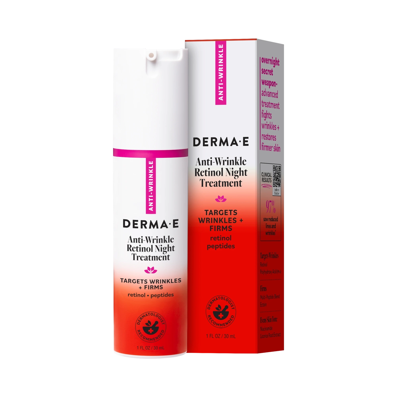 Ready to turn the clock back 9 years?* DERMA E’s Anti-Wrinkle Retinol Night Treatment is an anti-aging powerhouse that is clinically proven to give you younger-looking skin overnight**. This concentrated formula works overtime while you sleep, combining line-smoothing retinol with our exclusive collagen-supporting multi-peptide blend to firm and plump skin. It’s your overnight secret weapon – 97% of people saw a reduction in wrinkles!***